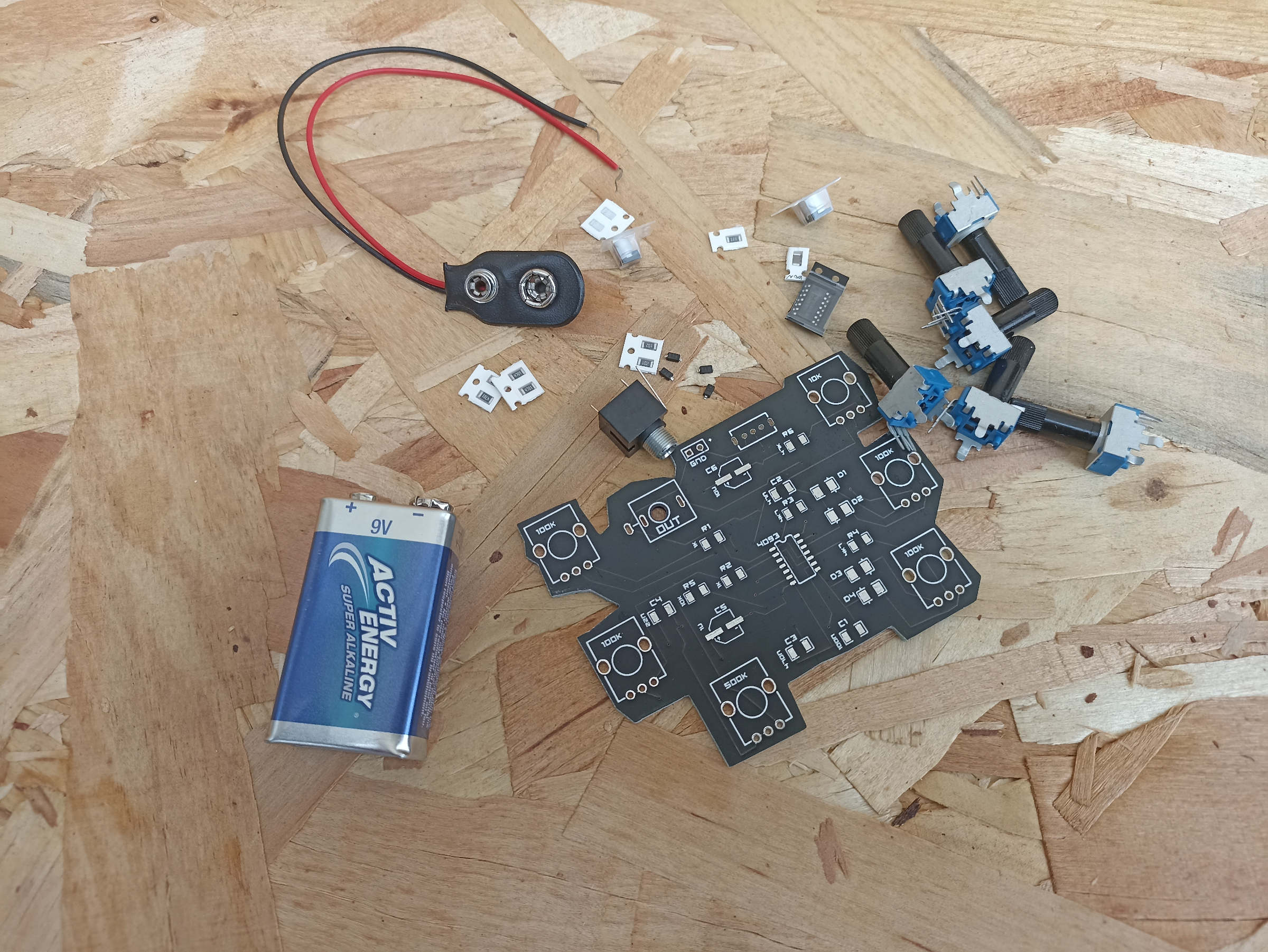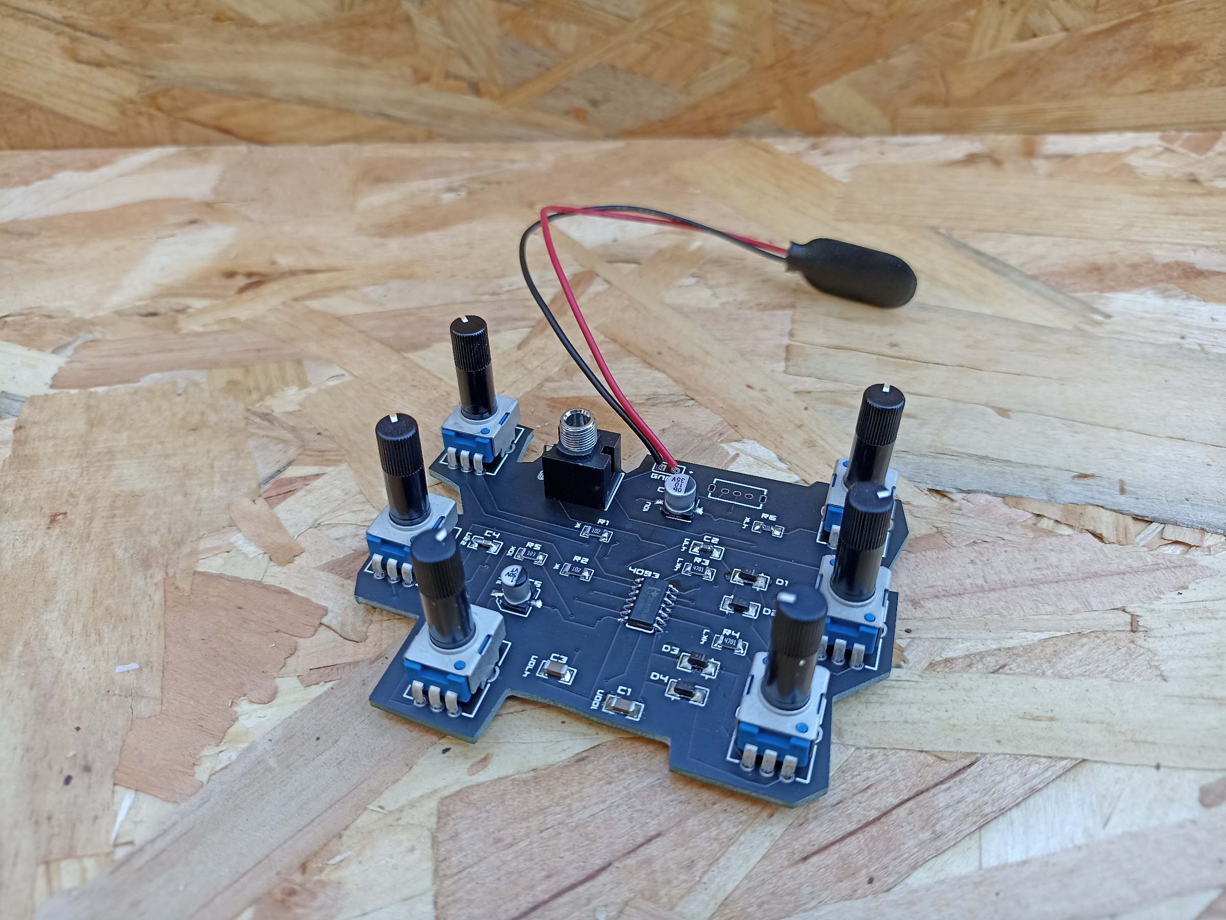 Petite noise box avec 6 potentiomètres pour moduler le son. Le kit est simple à assembler, il permet une première approche de la soudure avec peu de composants.