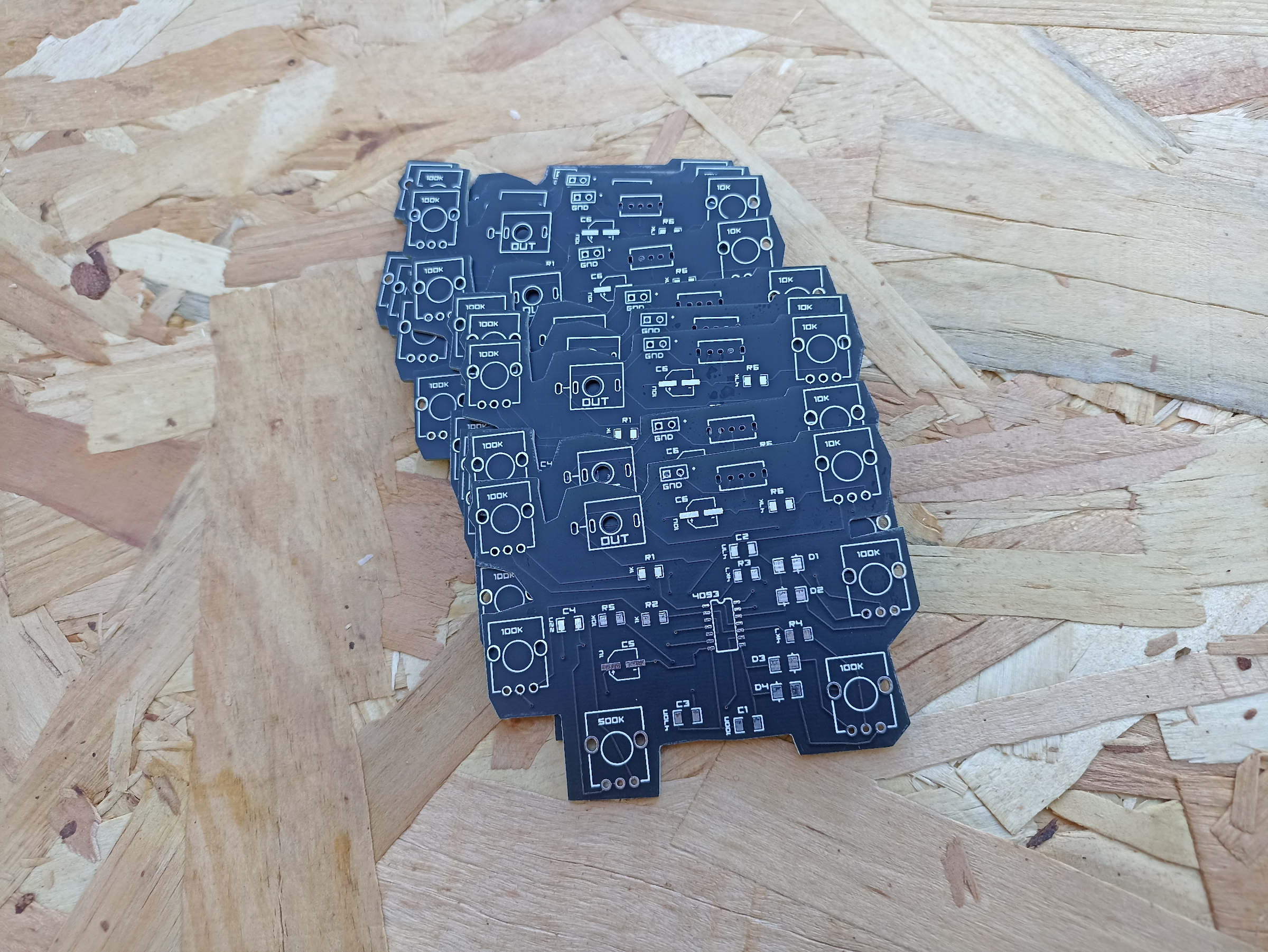 Sur la même carte se trouvent la petite noise machine, un filtre, un delay, 4 lfo et un mixer. 2 cv in et 1 audio in pemettent l'interface avec un environnement modulaire.